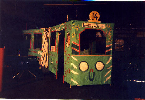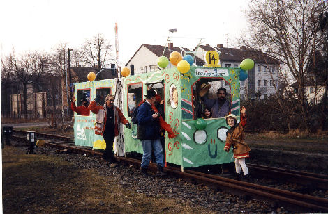 Eine Straßenbahn im Lumpemontagszug, damit die Neu-IsenburgerInnen mal sehen, was ihnen fehlt und was sie haben könnten von Sprendlingen bis zum Frankfurter Hauptbahnhof mit Anschluss an die Westtangente.